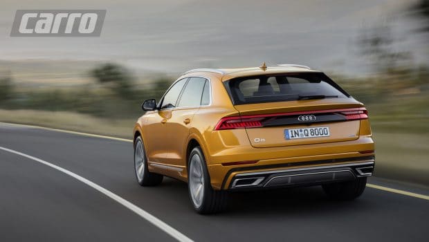 A traseira tem lanternas horizontais interligadas e o conjunto tampa/vidro traseiro bastante inclinado. Com 4,99 metros de comprimento, 2,00 m de largura e 1,71 m de altura, o Q8 é mais largo, curto e baixo que o ‘irmão’ Q7. O porta-malas tem 605 litros de capacidade.