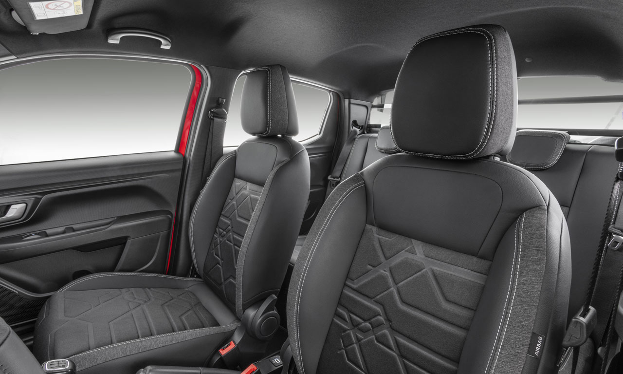 Painéis de porta são exclusivos da picape, assim como os bancos, com mescla de tecido e material que imita couro na versão avaliada. O espaço na dianteira é satisfatório, exceto pela proximidade entre os pedais. Já na traseira, apesar de as duas portas traseiras facilitarem bastante o acesso, o espaço é restrito para os joelhos e ombros de ocupantes adultos. A impressão de espaço poderia ser ligeiramente melhor se teto e colunas trocassem o tom preto por revestimento na cor clara.