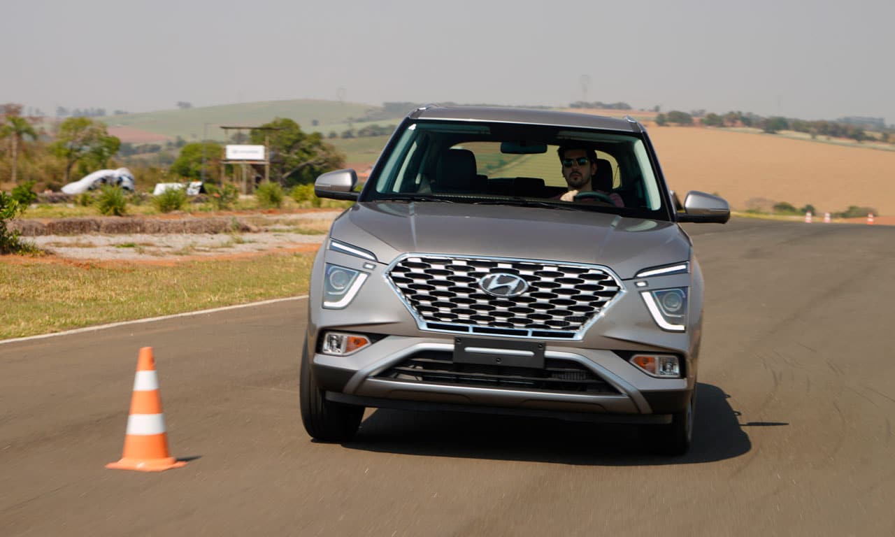 Nosso contato com o novo Creta 2022 aconteceu na pista do Haras Tuiuti, no interior de São Paulo. Começamos nosso test-drive a bordo da versão Platinum 1.0, a mais cara com este motor. O SUV mostra notável evolução dinâmica em relação ao antecessor, com respostas mais diretas da direção e rolagem mais contida da carroceria em curvas graças à nova calibração do conjunto de suspensão (que manteve o arranjo do tipo McPherson, na dianteira, e por eixo de torção, na traseira).