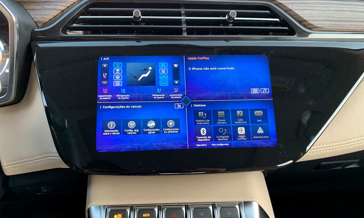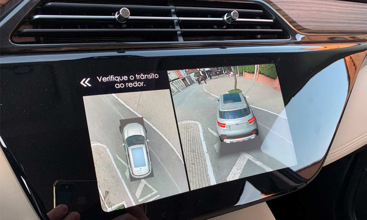 Largas, as colunas dianteiras e traseiras exigem atenção com os pontos cegos. Felizmente, há retrovisores com amplo campo de visão e câmeras de estacionamento 360°, com ótima resolução e grafismos tridimensionais do carro que auxiliam bastante o motorista em manobras.