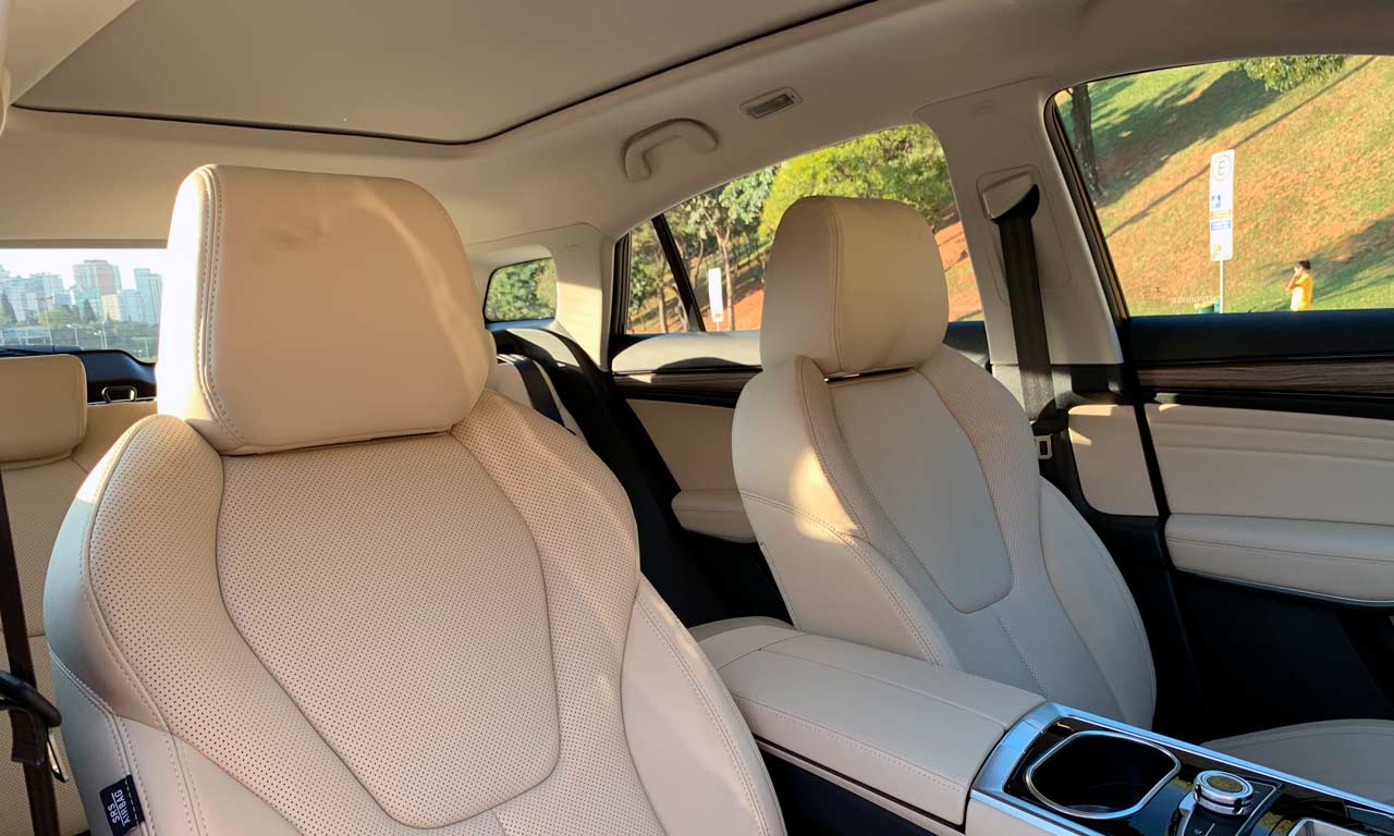 Os materiais de acabamento também saltam aos olhos, com couro de boa qualidade em bancos, painel e portas, peças emborrachadas e com encaixes justos. Destoam do conjunto apenas as teclas do volante e o acabamento plástico da alavanca de câmbio, ambos com aspecto simplório. Na versão avaliada, a iluminação ambiente personalizável, com opção de 7 cores, aumenta a percepção de refinamento. Os ocupantes do banco traseiro têm entrada USB e saída de ventilação dedicada.