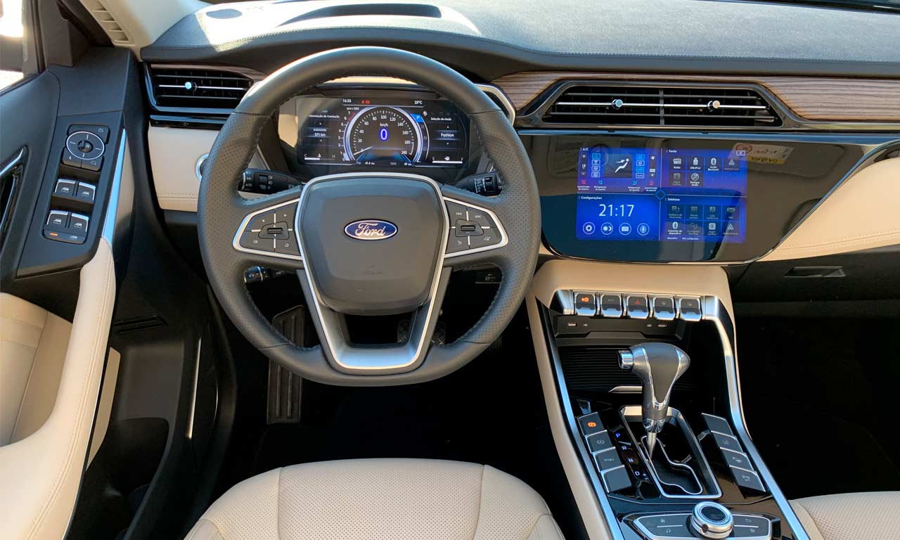 A central multimídia possui tela de 10,1 polegadas e é compatível com espelhamento sem fio de Apple CarPlay, além de Android Auto pelo método convencional (via cabo). A tela possui visual diferente dos Ford nacionais e permite a personalização em diferentes proporções, destacando informações escolhidas pelo motorista (como os comandos de ventilação ou mídia a reproduzir, por exemplo).