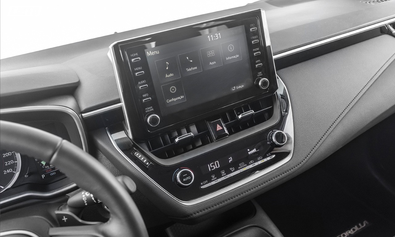 A central multimídia traz uma esperada evolução na linha Toyota: a compatibilidade com Android Auto e Apple CarPlay. O espelhamento de celulares é feito por meio de uma entrada USB escondida na parte inferior do painel. Como em outros modelos da marca japonesa, entretanto, o sistema nativo da multimídia deve em agilidade e quantidade de recursos na comparação com rivais como Cruze e Jetta.