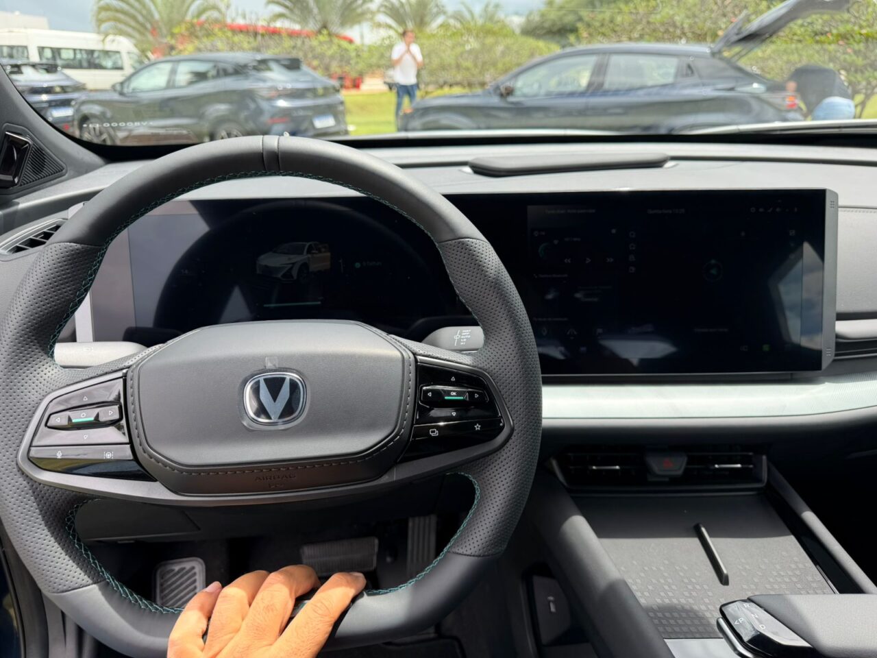 Na cabine, o Uni-T traz painel com duas telas integradas que somam 25,1”, além de conectividade sem fio, comandos por voz e iluminação ambiente configurável.