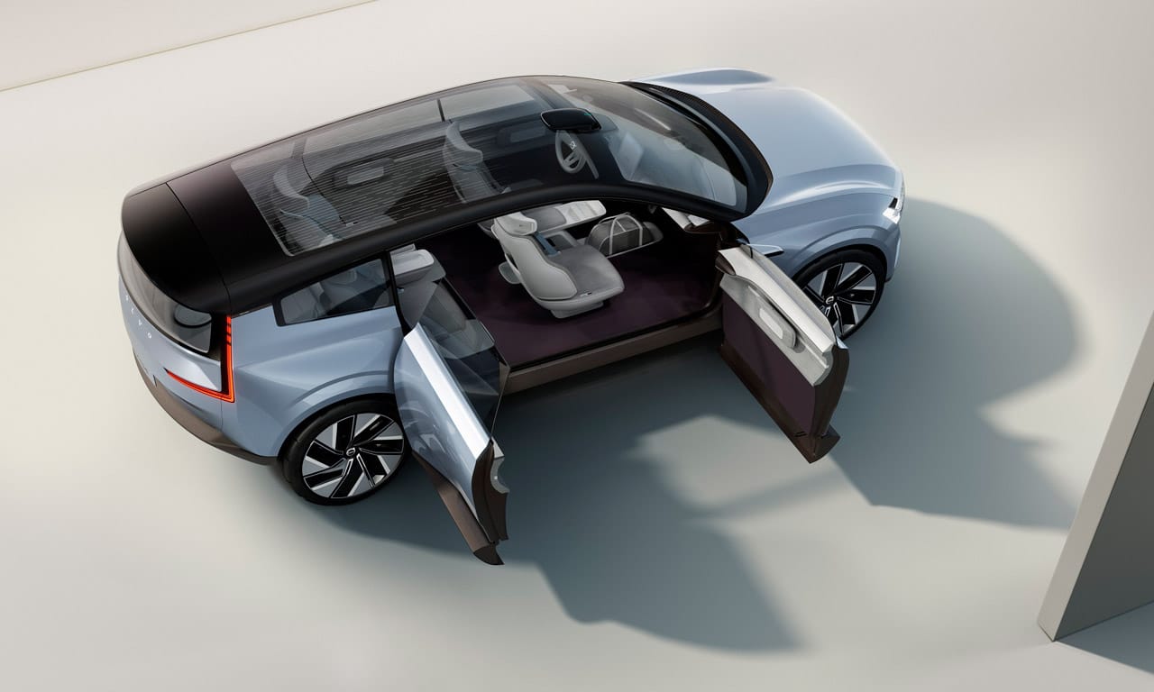 O Concept Recharge exibe para-choque integrado à “grade”, totalmente fechada devido à propulsão 100% elétrica, como no XC40 Recharge. O protótipo traz ainda câmeras no lugar dos retrovisores, radar e sensor LiDar acima do para-brisa e teto pintado na cor preta. Ao ser projetado para ser exclusivamente elétrico, o novo modelo tem como vantagem o foco no espaço interno, já que a ausência de motor a combustão permitiu maior entre eixos e melhor acomodação da bateria no assoalho, que é inteiramente plano.