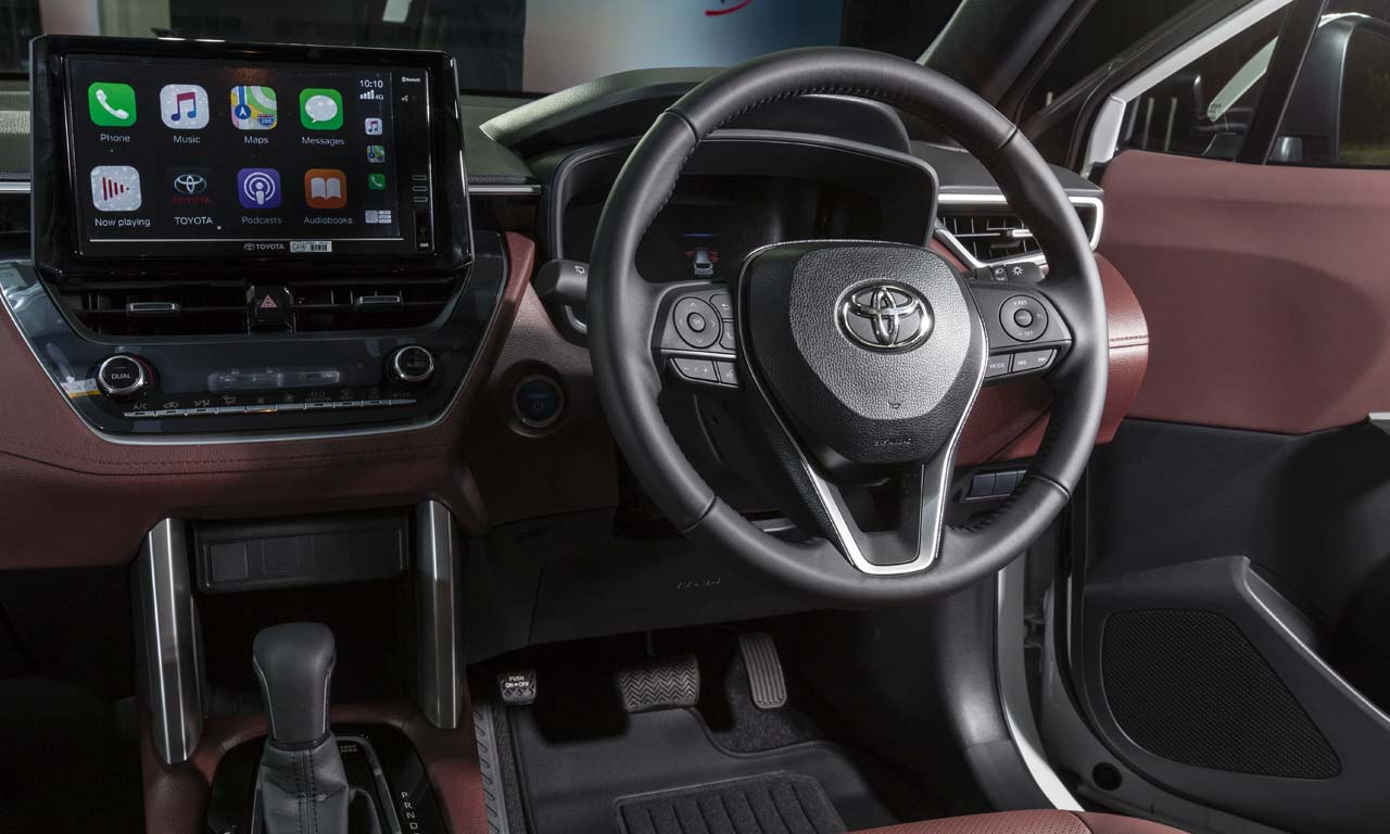 Na cabine, o Corolla Cross replica basicamente o painel do sedã, com os mesmos volante, central multimídia (de 9”) e quadro de instrumentos parcialmente digital. O SUV não terá a alavanca de freio de estacionamento no console, como no sedã nacional. Porém, isso não quer dizer que a marca irá investir em freio de estacionamento com acionamento eletromecânico, por botão, como no Jeep Compass. Ao estacionar o veículo, o motorista deverá acionar o velho pedal à esquerda, próximo ao descanso para o pé.