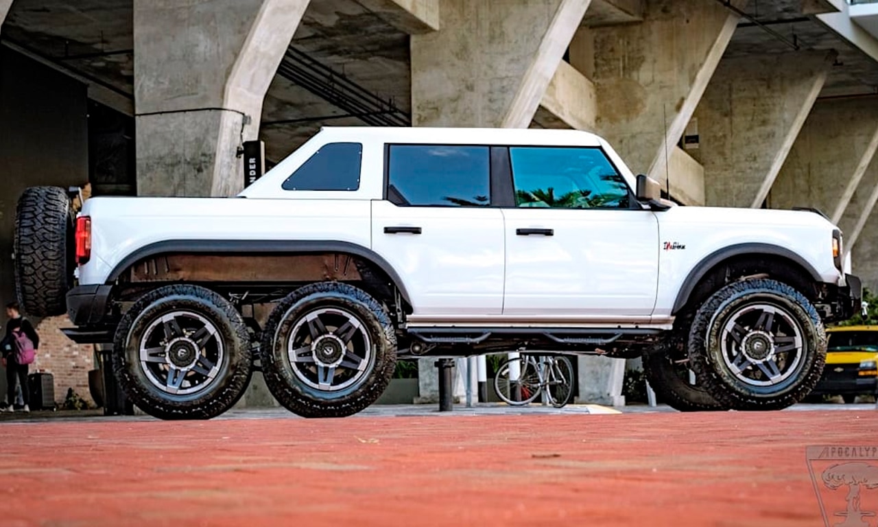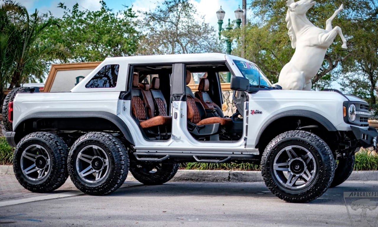 A empresa norte-americana Apocalypse, especializada em produzir veículos fora de estrada com seis rodas, adotou o Ford Bronco em seu nova criação. Batizado de Dark Horse, o primeiro exemplar desse modelo será vendido em um leilão da famosa Barrett-Jackson na Flórida (EUA) em abril.