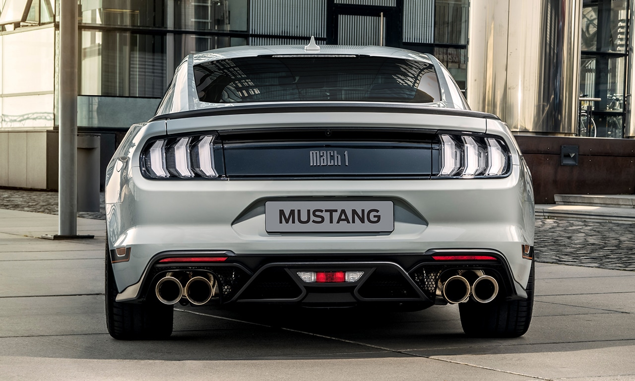 Visualmente, ele traz diversos componentes projetados para melhorar a aerodinâmica, como o aerofólio exclusivo e as duas grades posicionadas na parte de baixo do para-choque dianteiro que servem para reduzir a turbulência. Além disso, o Mach 1 exibe a característica grade frontal com um elemento interno que a diferencia das demais versões do Mustang. Completam o design as faixas laterais e no capô e as rodas de 19 polegadas. Por dentro, destaque para a placa numerada que identifica se tratar de uma edição limitada.