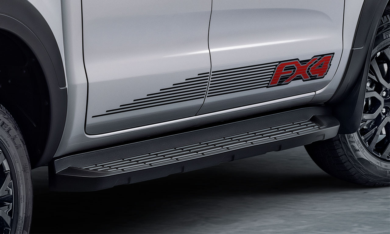 Na lateral, a picape recebe rodas escurecidas de 18 polegadas com pneus de uso misto (Pirelli ATR), molduras plásticas nos para-malas, adesivo FX4 nas portas dianteiras, estribos e santantônio com novo formato. A traseira da Ranger FX4 traz ainda para-choque na cor preto brilhante e lanternas escurecidas. Como acessório original vendido em concessionária, a picape terá Snorkel e caixa organizadora de caçamba. Opcionalmente, por R$ 2 mil extras, a FX4 pode vir de fábrica com rodas de 17 polegadas e pneus off-road (Pirelli Scorpion AT+).