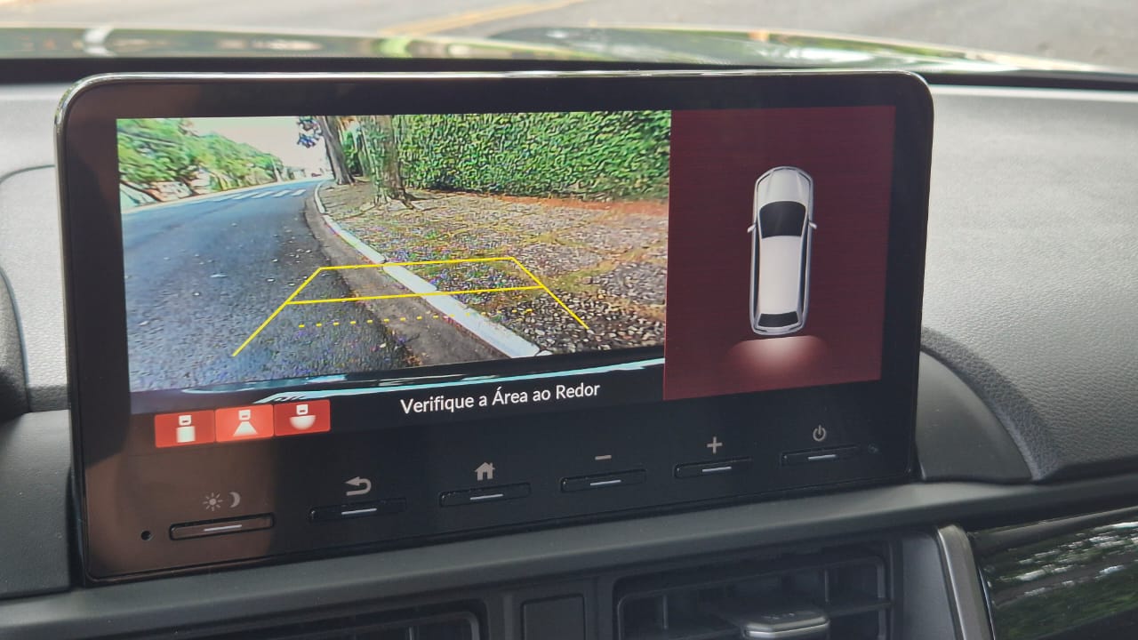 O painel combina mostrador digital de um lado e analógico do outro, configuração já conhecida em outros modelos da marca. O volante possui comandos multifuncionais e aletas para trocas simuladas. A central multimídia oferece espelhamento com e sem fio, além de comandos físicos. O sistema inclui câmera de ré. Há também botões físicos na central e no ar-condicionado digital, o que ajuda a mexer sem ficar caçando funcionalidade na tela. Falando da tela, ela funciona bem com cores vivas e toque igual ao de um smartphone, que conecta sem engasgos com fio e sem fio.