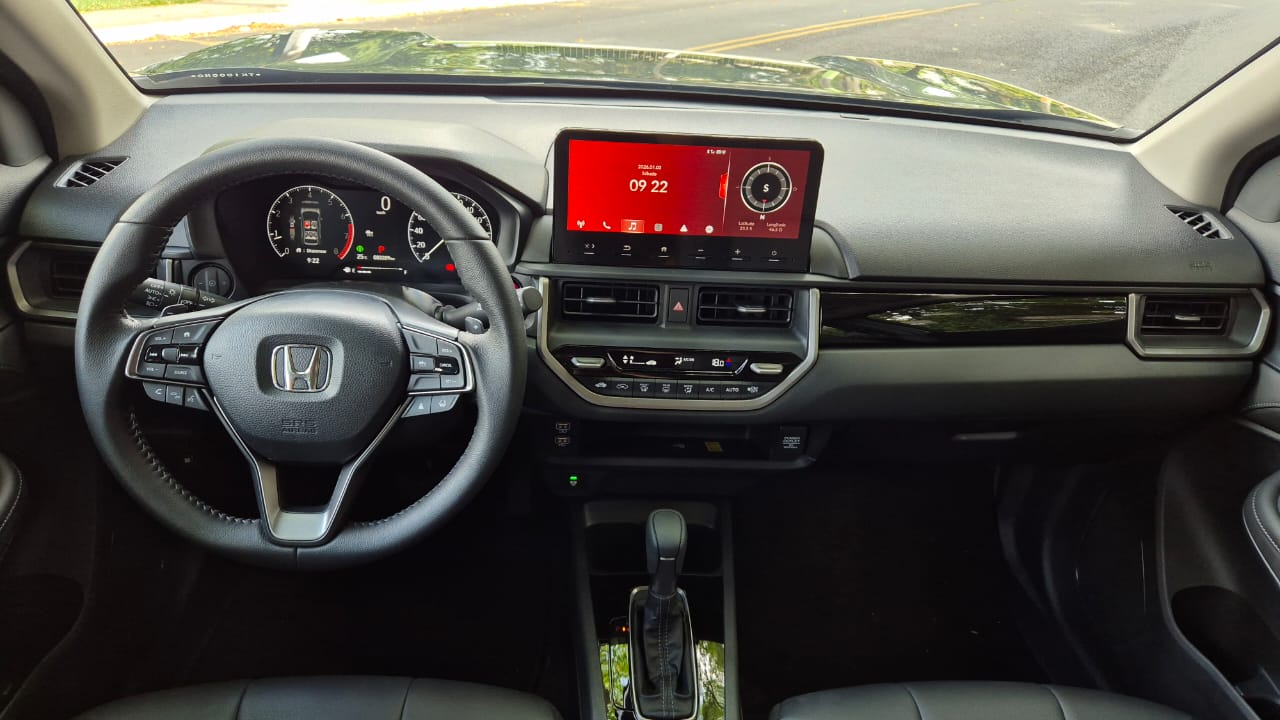 Por outro lado, o modelo traz freios a tambor no eixo traseiro e mantém o freio de estacionamento por alavanca, sem acionamento eletrônico. Também chama atenção a ausência de portas USB-C, mesmo em um carro lançado recentemente, além da central multimídia com brilho limitado e alta reflexão. A câmera de ré tem qualidade abaixo do esperado para a categoria, não há câmera 360° nem na versão topo de linha, e o retrovisor interno não conta com função eletrocrômica. Completam o pacote a iluminação interna ainda com lâmpadas halógenas e um nível de equipamentos inferior ao do HR-V.