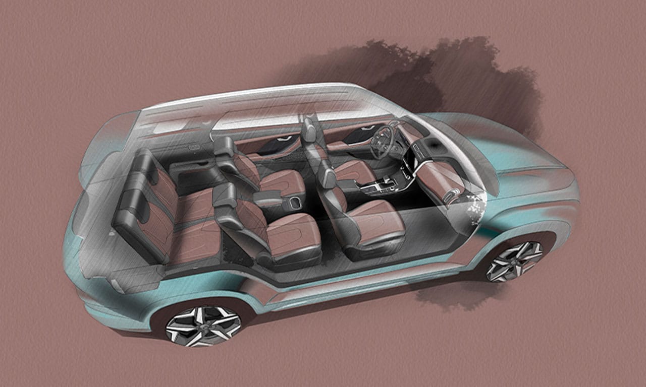 A imagem do interior também confirma que o Alcazar terá o mesmo painel, console e volante do Creta indiano. A versão revelada possui arranjo de seis lugares, com direito a segunda fileira com bancos individuais e console central-traseiro com apoio de braço e porta-objetos. Apesar disso, o Alcazar terá opção de 7 lugares ao todo, com banco central inteiriço. Mesmo com os bancos rebatíveis da terceira fileira em uso, o espaço no porta-malas parece bastante razoável.