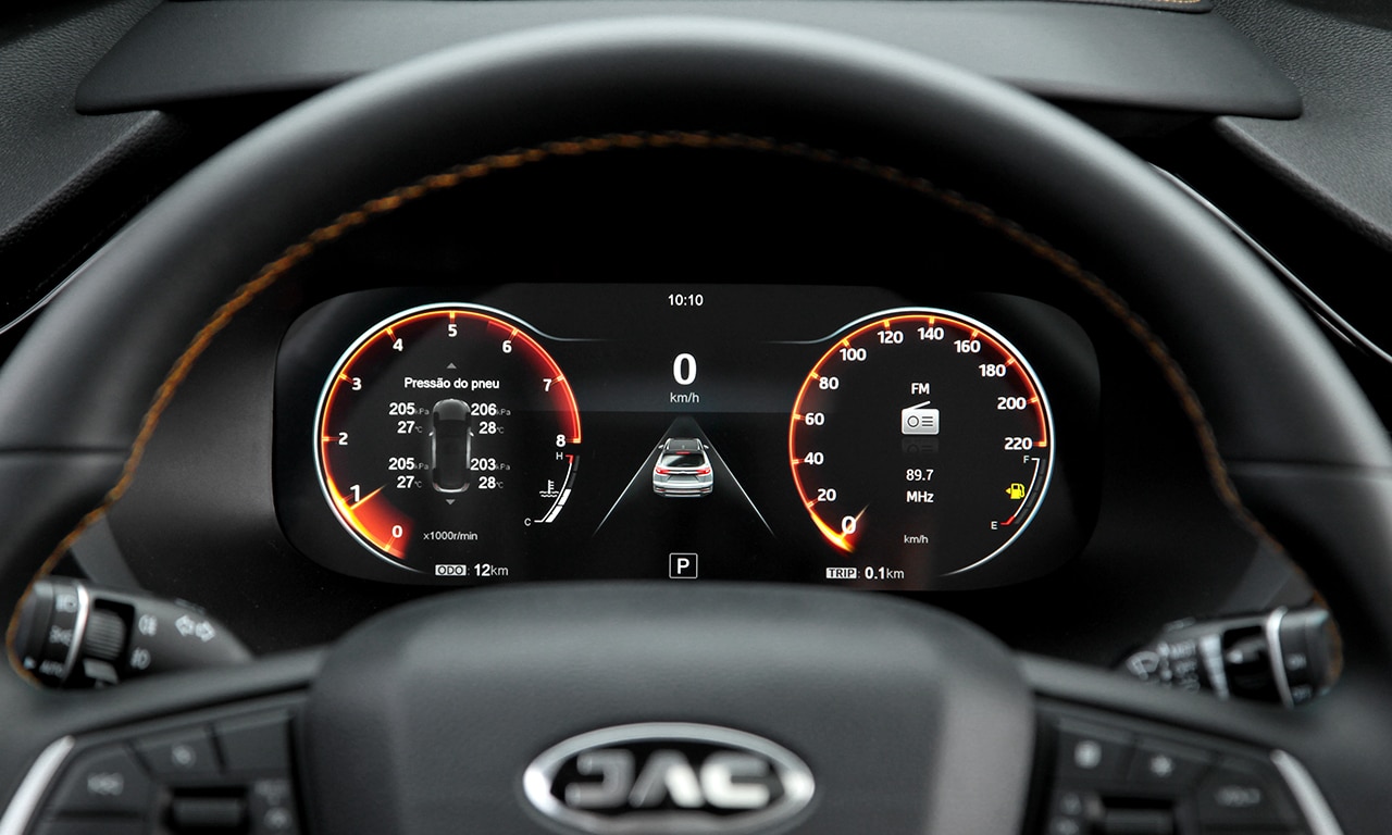 A lista de equipamentos inclui controle de tração e estabilidade, assistente de partida em rampas, travamento automático das portas a 15 km/h, monitoramento de pressão dos pneus, freios a disco nas quatro rodas, sensor de estacionamento dianteiro e traseiro, retrovisor interno antiofuscante, controlador de velocidade, acendimento automático dos faróis, isofix, direção elétrica e volante multifuncional.