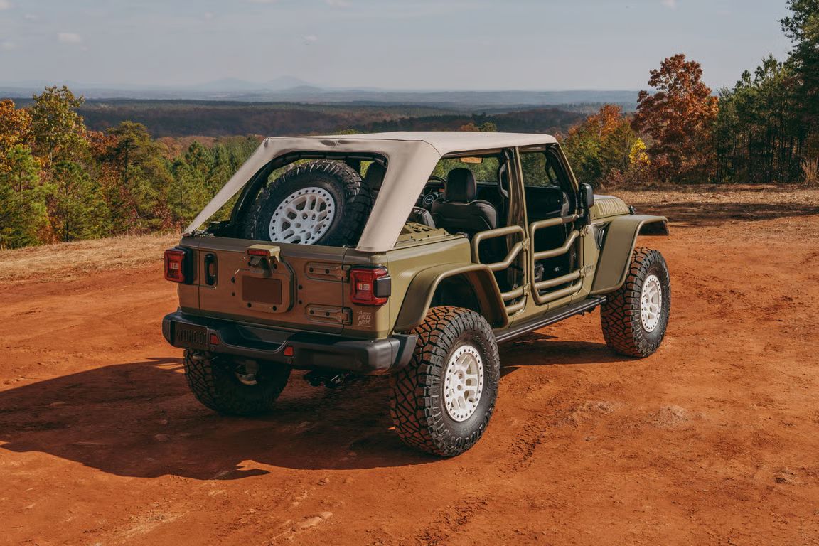 A carroceria adota pintura em verde oliva, portas tubulares e estepe reposicionado para o interior da cabine. No interior, o Wrangler Commando traz acabamento em couro bege e detalhes que remetem ao estilo clássico do modelo original.