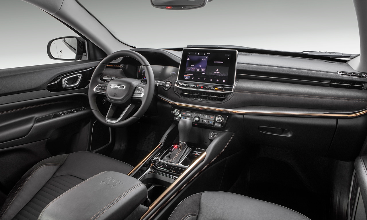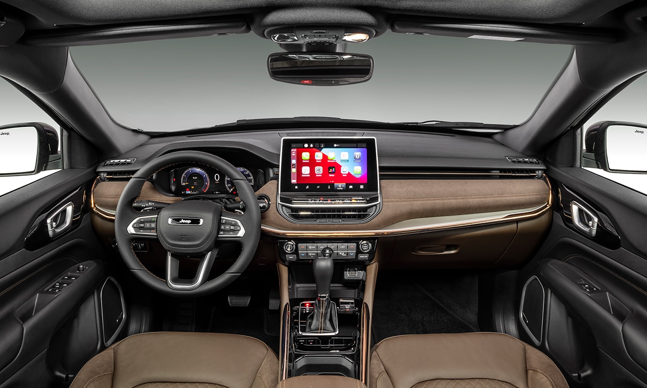 No interior, o modelo traz o mesmo desenho do Compass, incluindo volante, quadro de instrumentos digital e central multimídia com tela flutuante. A principal diferença, além dos 7 lugares e maior espaço, está no acabamento, com revestimentos em suede marrom em parte do painel e dos bancos na Overland. Os bancos, aliás, são revestidos de couro e exibem o logo da Jeep nos encostos em ambas as configurações.