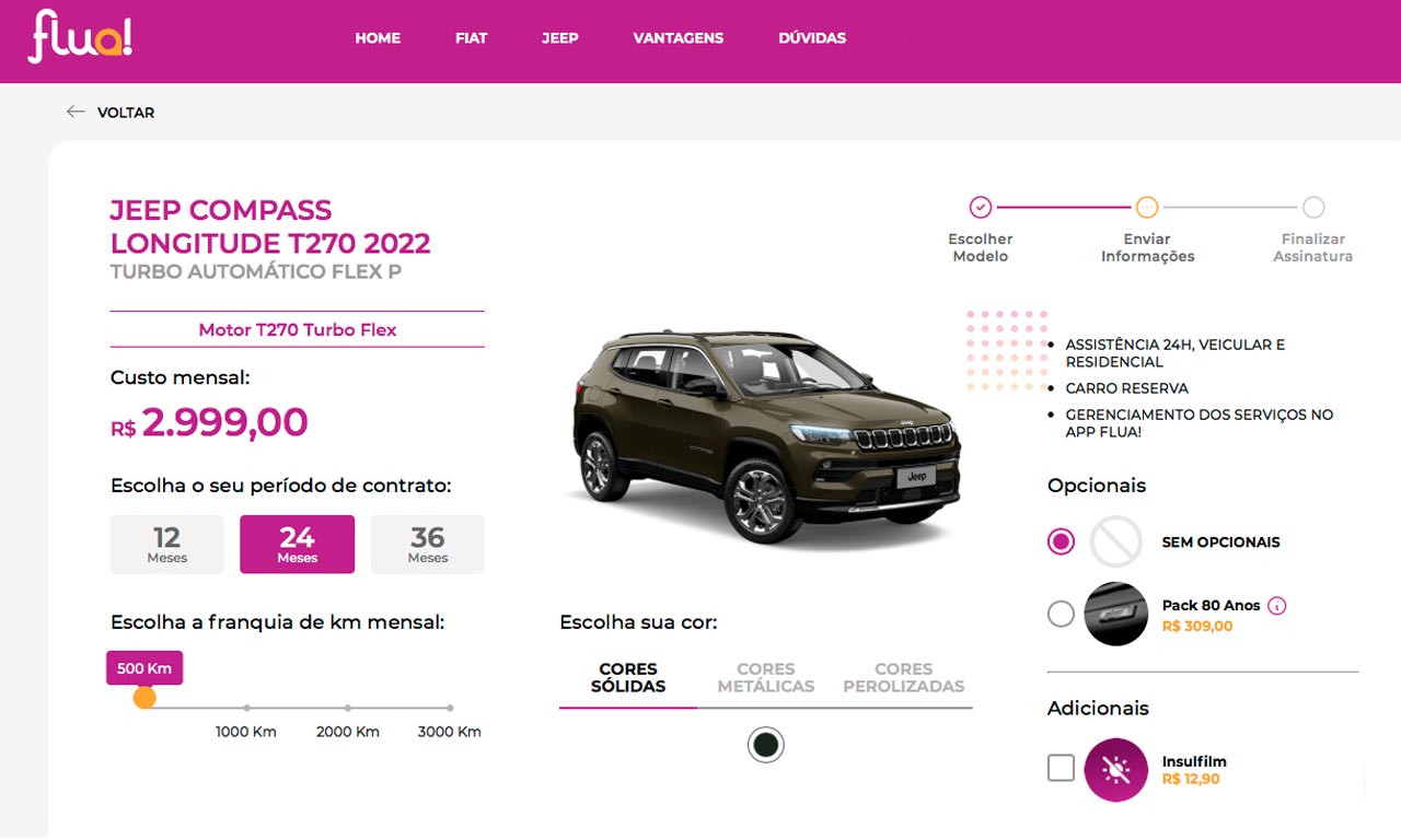 O valor inicial é referente à versão Longitude T270 (sigla que identifica o novo motor 1.3 GSE Turbo de 185 cv de potência) do Compass 2022, em contrato de 2 anos e franquia de rodagem mensal de 500 km. Para franquia de 1.000 km, a mensalidade parte de R$ 3.199.