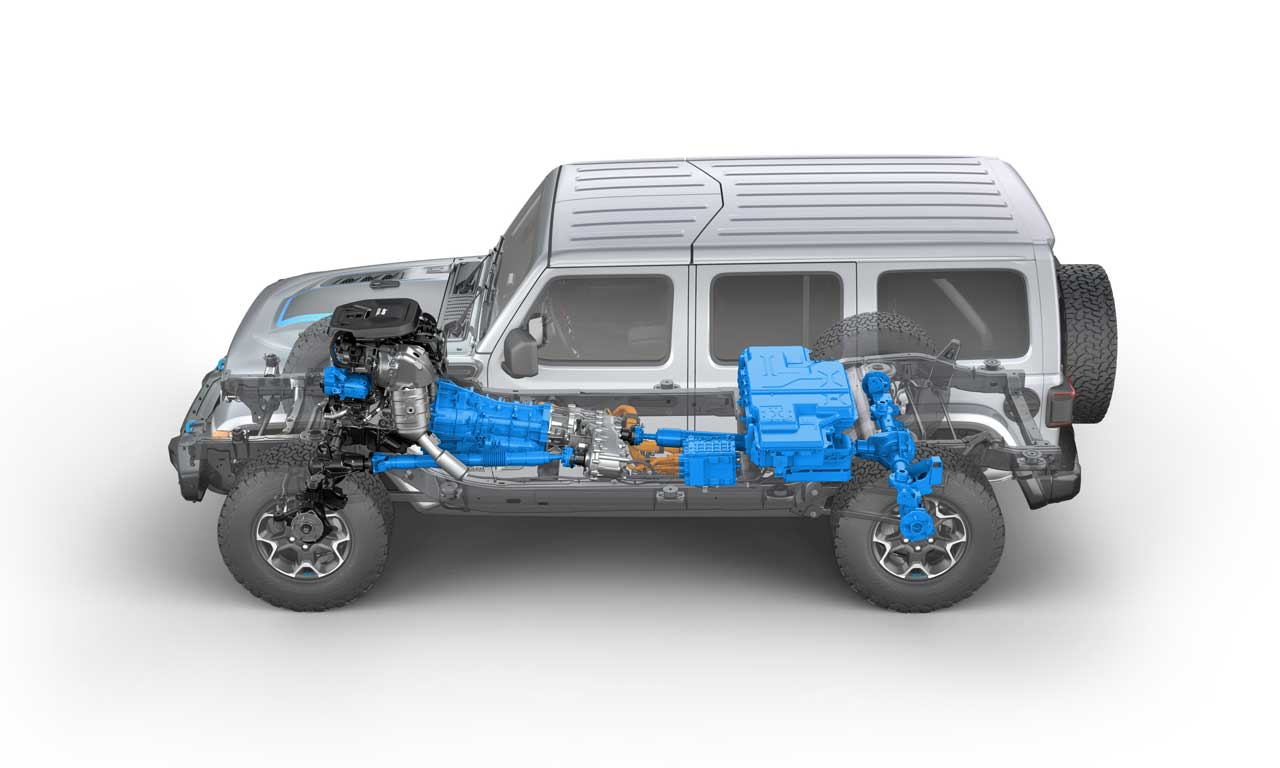 O Wrangler híbrido combina o motor 2.0 turbo a dois motores elétricos para entregar 355 cv de potência combinada e 61 kgfm de torque combinado. O modelo mantém a capacidade off-road das versões somente a combustão, com suspensão de eixo rígido à frente e atrás, caixa de transferência de duas velocidades (4×4 full time) e capacidade de submersão de até 760 mm. O câmbio é automático de oito marchas.