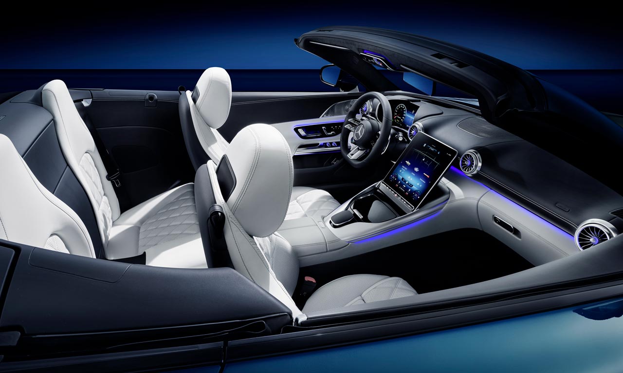 A cabine do novo Mercedes-Benz SL mantém laços com o antecessor pela manutenção das quatro saídas de ventilação circulares e individuais. O quadro de instrumentos possui tela digital de 12,3” com alta resolução e coberturas laterais a fim de evitar reflexos causados por luz solar.