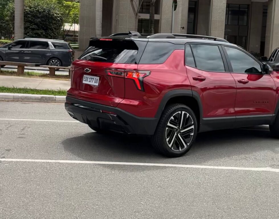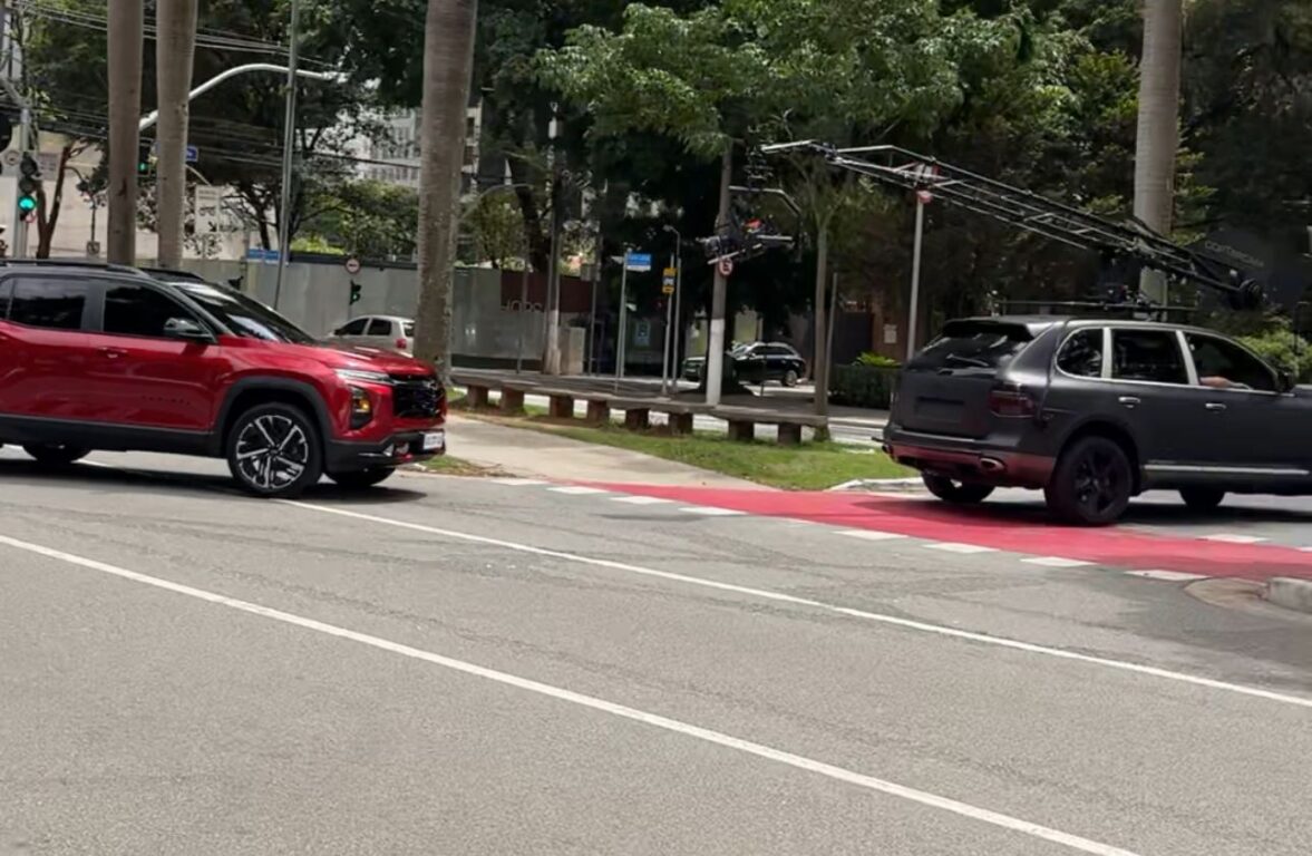 As imagens mostram o SUV na cor vermelha com placa do padrão adotado nas imagens de divulgação da Chevrolet em seus produtos, acompanhado e outro carro que atua como “camera car”.