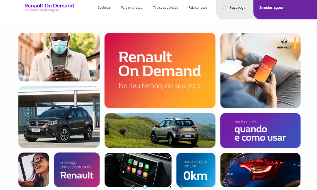 A Renault lança no Brasil um programa de assinatura de carros zero-quilômetro. Chamado de Renault On Demand, o serviço será oferecido em todo o País e terá 3 modelos disponíveis: Kwid, Stepway e Duster. O plano mais barato será para o Kwid Zen, com mensalidades de R$ 869 em plano de 20 meses para contratação via pessoa jurídica – para pessoas físicas, preços partem de R$ 919/mês.