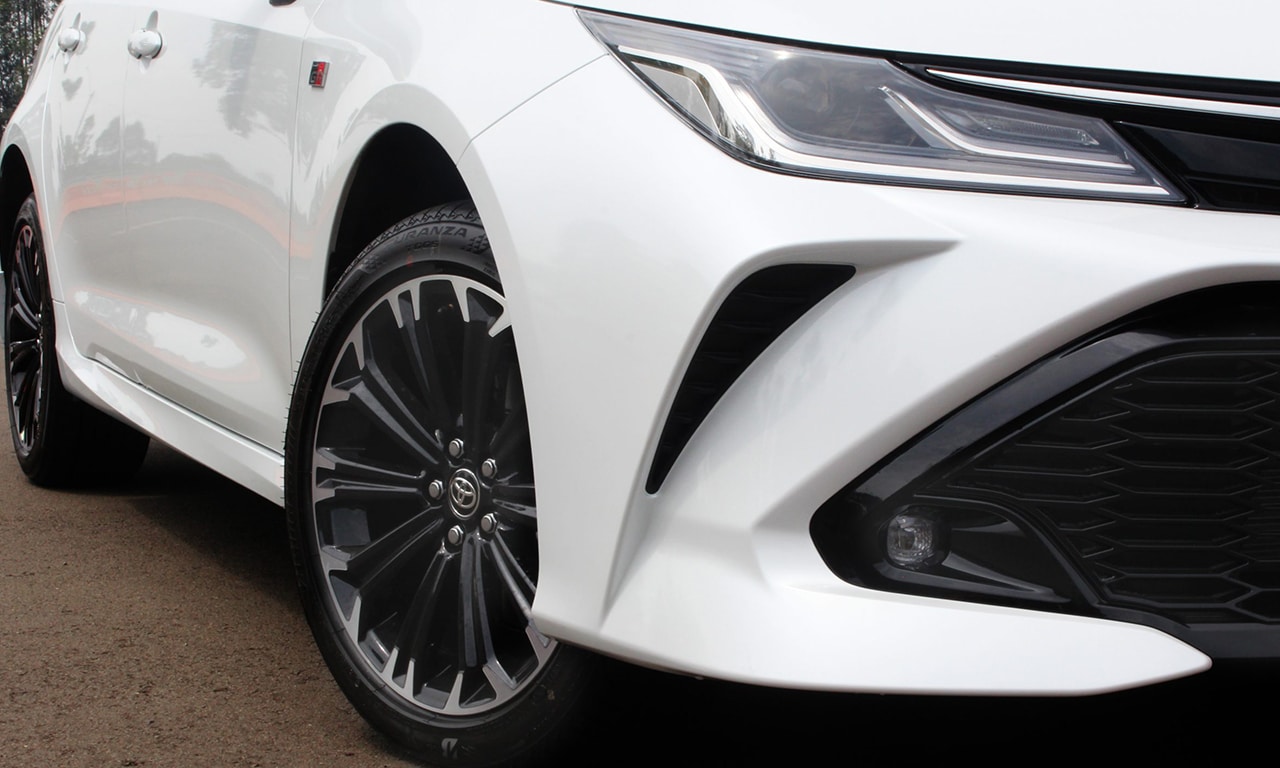 Por fora, a versão traz faróis de LED com acendimento automático, faróis de neblina e luzes diurnas (DRL) também de LED, saias laterais, rodas de liga leve 17″ exclusivas, emblemas nas laterais, retrovisores externos e teto pintados na cor preta metálica e para-choques dianteiro e traseiro com design diferenciado. Já a traseira exibe spoiler exclusivo Gazoo Racing, lanternas de LED e emblemas que identificam esta versão.