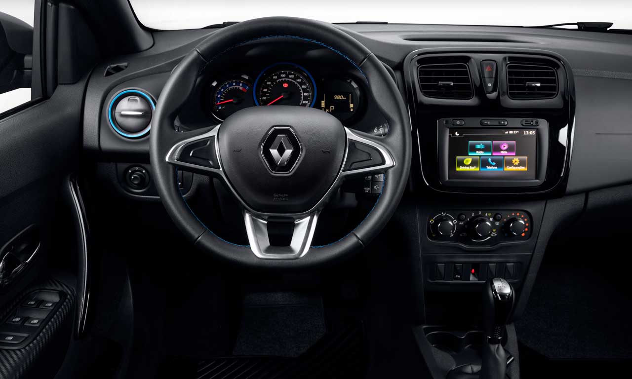 Do lado de dentro, o Sandero GT Line traz detalhes em azul, incluindo as costuras do volante em couro e da coifa da alavanca de câmbio.