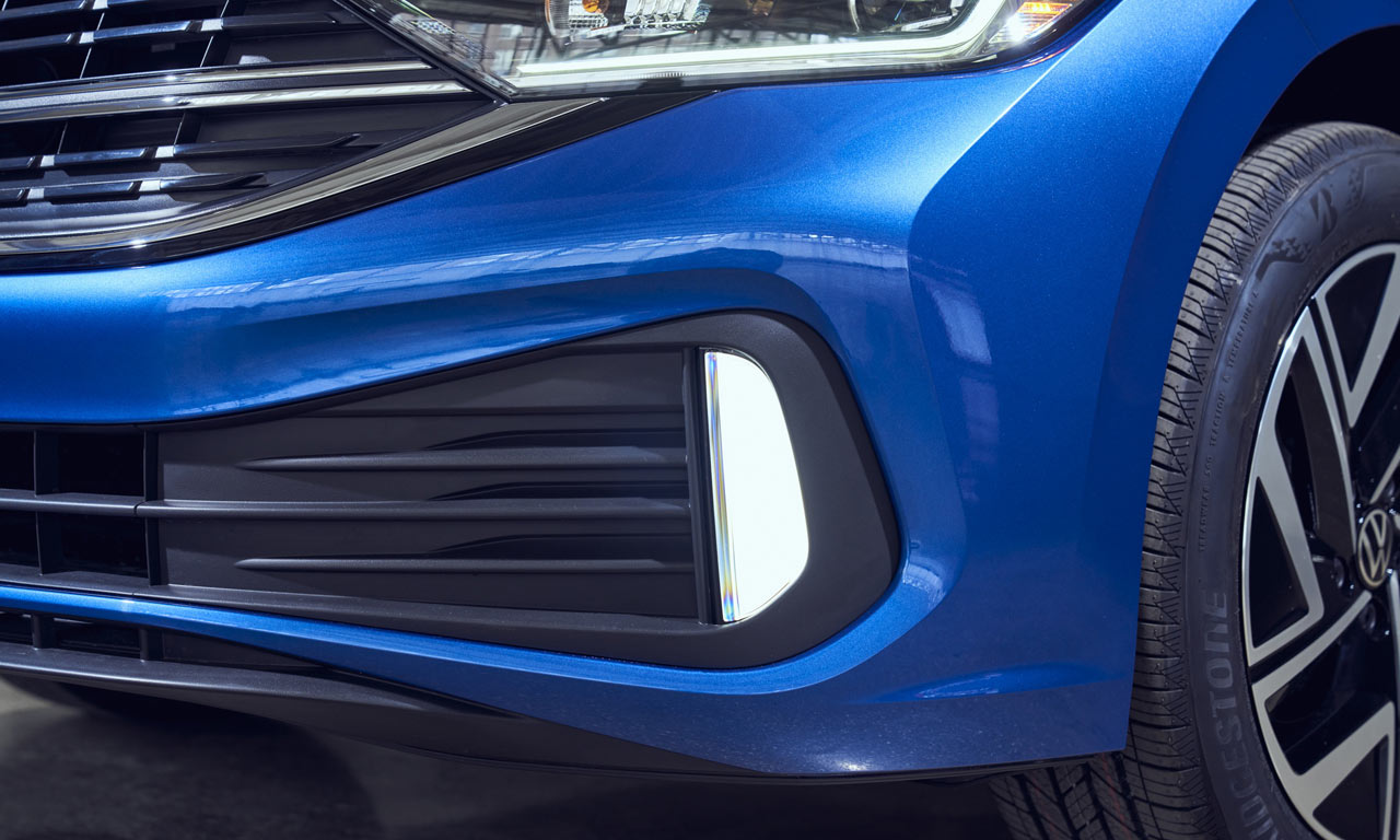 O Jetta 2022 ganhou novo para-choque dianteiro, com maior entrada de ar e luzes de neblina verticais, que remetem ao desenho do Nivus. A grade manteve o formato do sedã atual, mas passa a ter contorno com moldura totalmente cromada e friso cromado duplo ao centro. Na traseira, somente o para-choque traz novos traços.