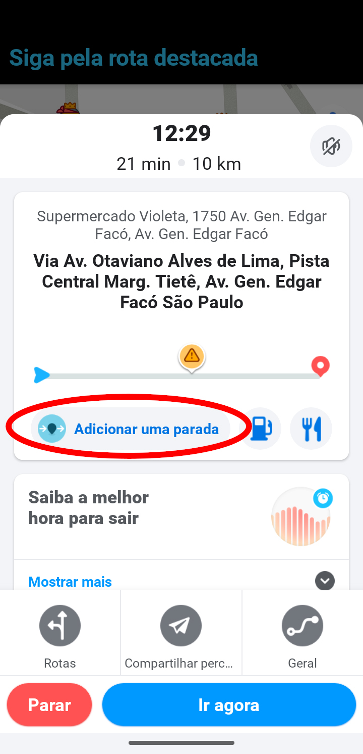 O recurso de adicionar paradas permite que o usuário programe uma rota passando por um ou mais lugares antes de chegar ao destino final. Ao apontar as paradas desejadas durante o caminho, o aplicativo traçará o percurso até o destino final, mas apontando o melhor caminho para as paradas desejadas.